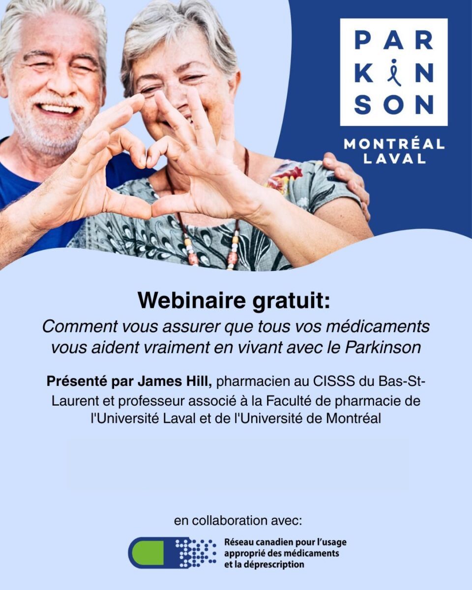 Au cours de cette présentation, vous apprendrez les principes d’une utilisation sécuritaire des médicaments en vivant avec le Parkinson, et comment repérer ceux qui pourraient vous causer des effets néfastes. Vous verrez aussi comment reconnaître si un médicament n’est peut-être plus adapté à votre situation personnelle.